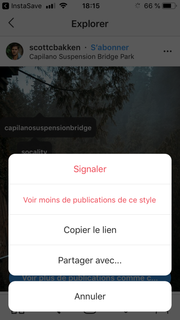 Allez dans votre application Instagram sur la photo que vous voulez enregistrer. Ensuite cliquez sur les 3 petits point en haut à droite de l’image puis cliquez sur Copier le lien.